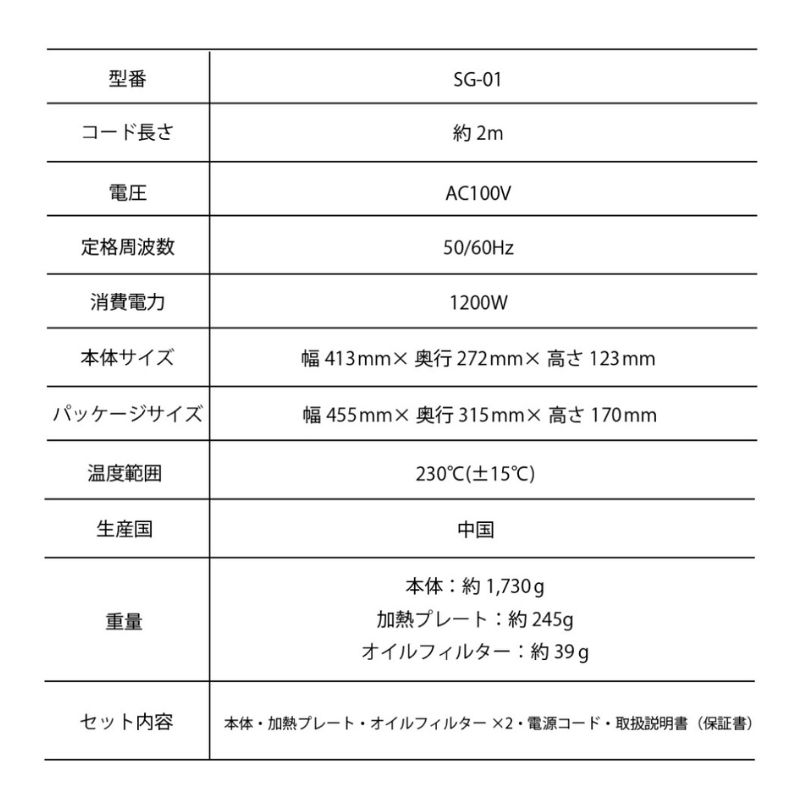 | 【注意事項】 ※使用中はグリルプレート全面に食材をのせず、一部を熱放散のため空けてください。 グリルプレートにすべて具材をのせて塞いでしまったり、大きな食材を焼いたり、プレートを全体を アルミホイルなどで覆わないでください。 ※温度設定はありません、電源のON,OFFスイッチのみの操作となります。 ※電源ON後、6~7分ほどプレートを予熱することで煙が出にくくなります。 ※プレートに焦げが発生すると煙が発生したりします。こまめに取り除くことで煙が発生しません。 ※小さなお子様やペットが触れないよう、水平なテーブルでご使用ください。 ※その他取扱説明書を必ずお読み頂きご使用ください。 |