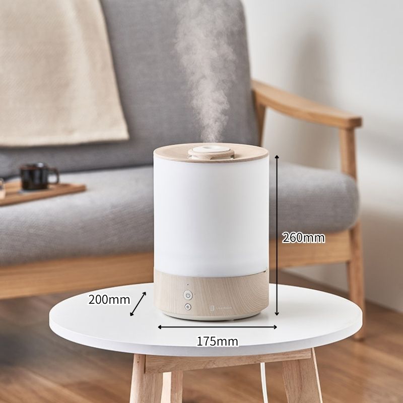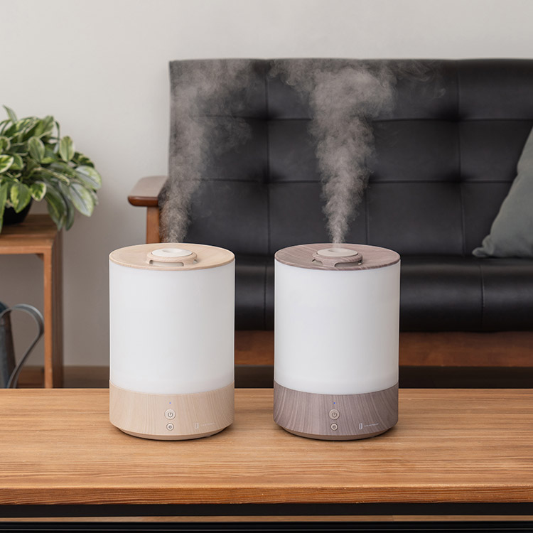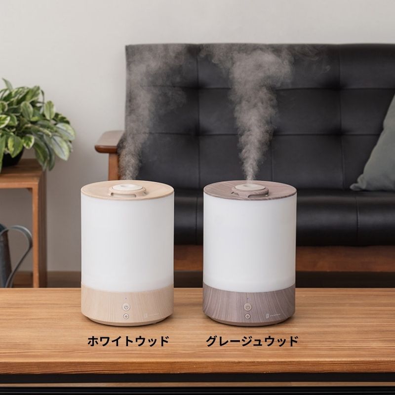 | インテリアに馴染むリアルな木目柄が魅力のスタイリッシュな加湿器。ナチュラルテイストに合わせたい、ホワイトウッドとグレージュウッドの2色展開。 |