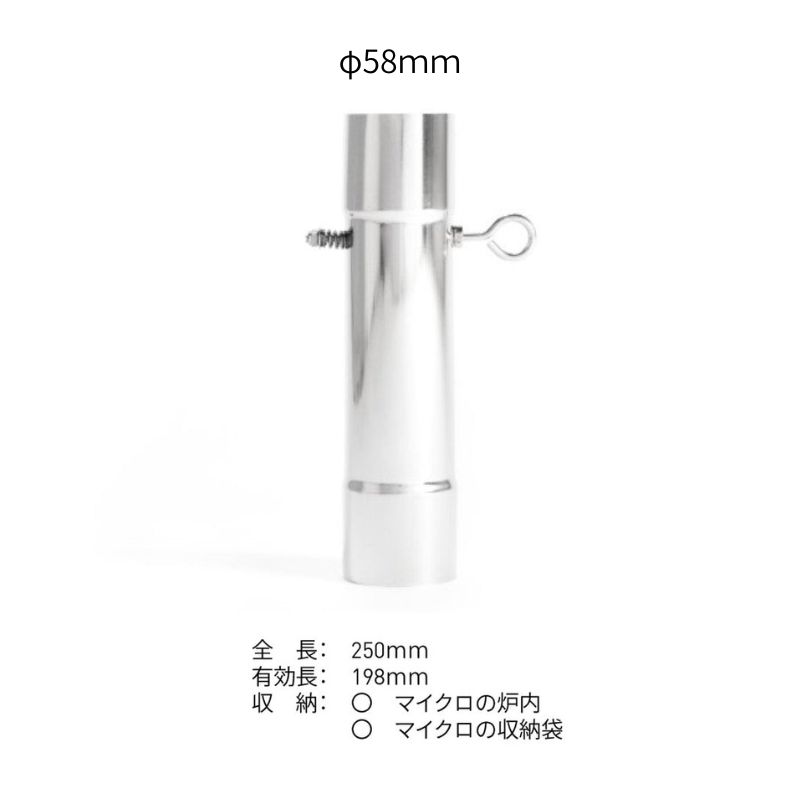 | 薪ストーブ マイクロシリーズの炉内に収納できる、専用サイズの煙突です。 ※マイクロシリーズの収納バッグの中には現行のφ58mm煙突(長さ32.5cm)も収納可能です。 |